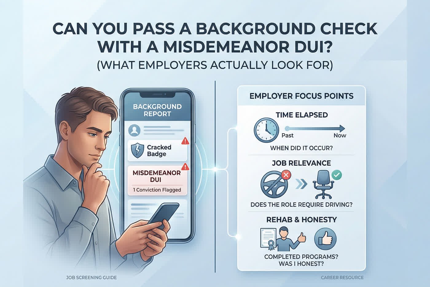 Can you pass a background check with a misdemeanor DUI? Yes, you can absolutely pass a background check with a misdemeanor DUI. For the vast majority of non-driving jobs, a single misdemeanor DUI is not an automatic disqualifier. Whether an employer decides to hire you depends on four main factors: the specific requirements of the job (such as if driving is involved), how much time has passed since the conviction, whether it was a one-time mistake or a repeat offense, and your state's specific employment laws.