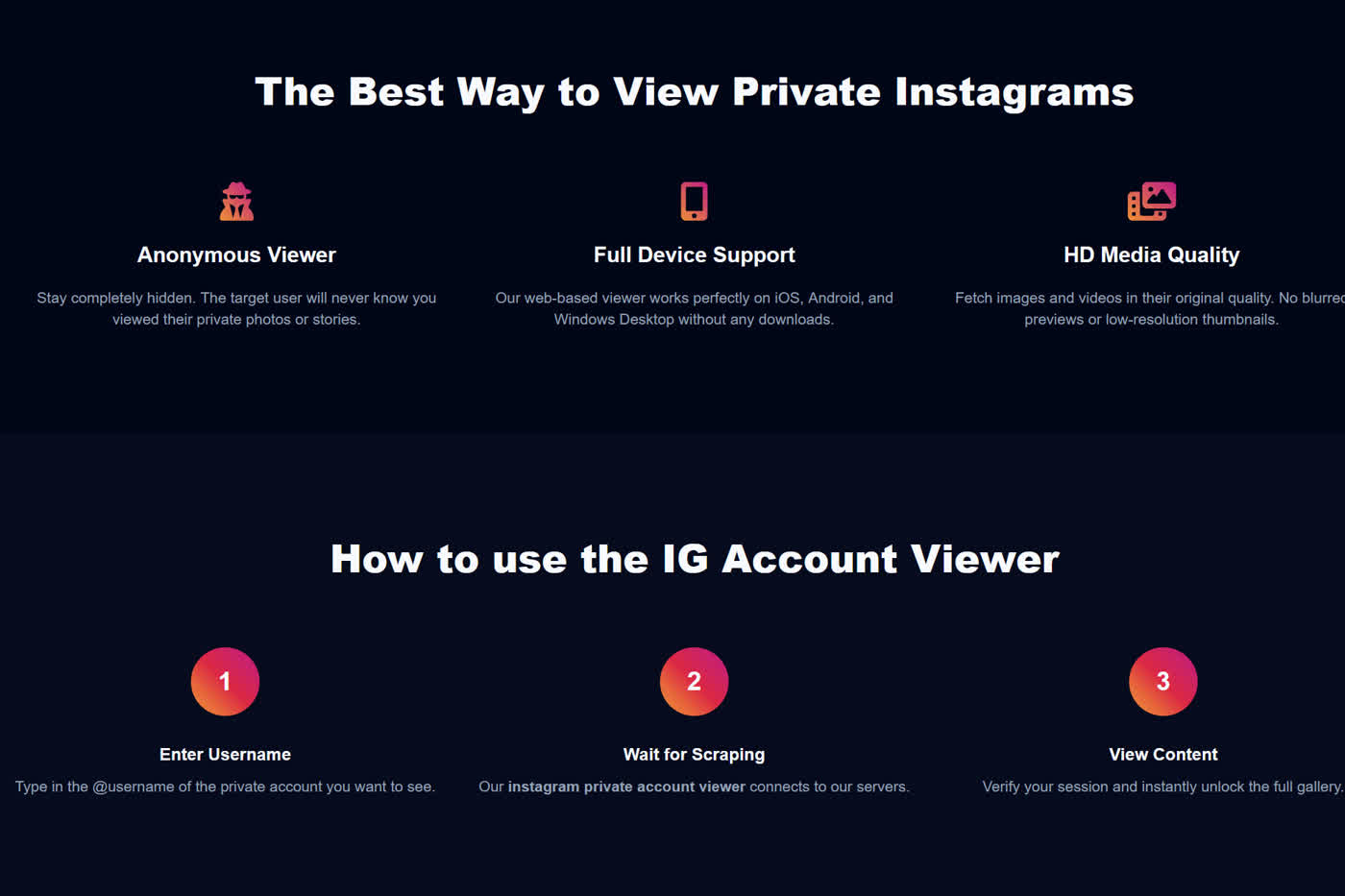 Top articles highlight the importance of specialized viewers for discreetly viewing private or protected Instagram content. These tools claim to enable users to browse profiles, stories, reels, and tagged photos secretly with features like no sign-up, no install, and complete anonymity. For those interested in public Instagram content, our Instagram account viewer is an ideal solution for viewing Instagram anonymously, allowing you to view public profiles, stories, and reels without any login.
